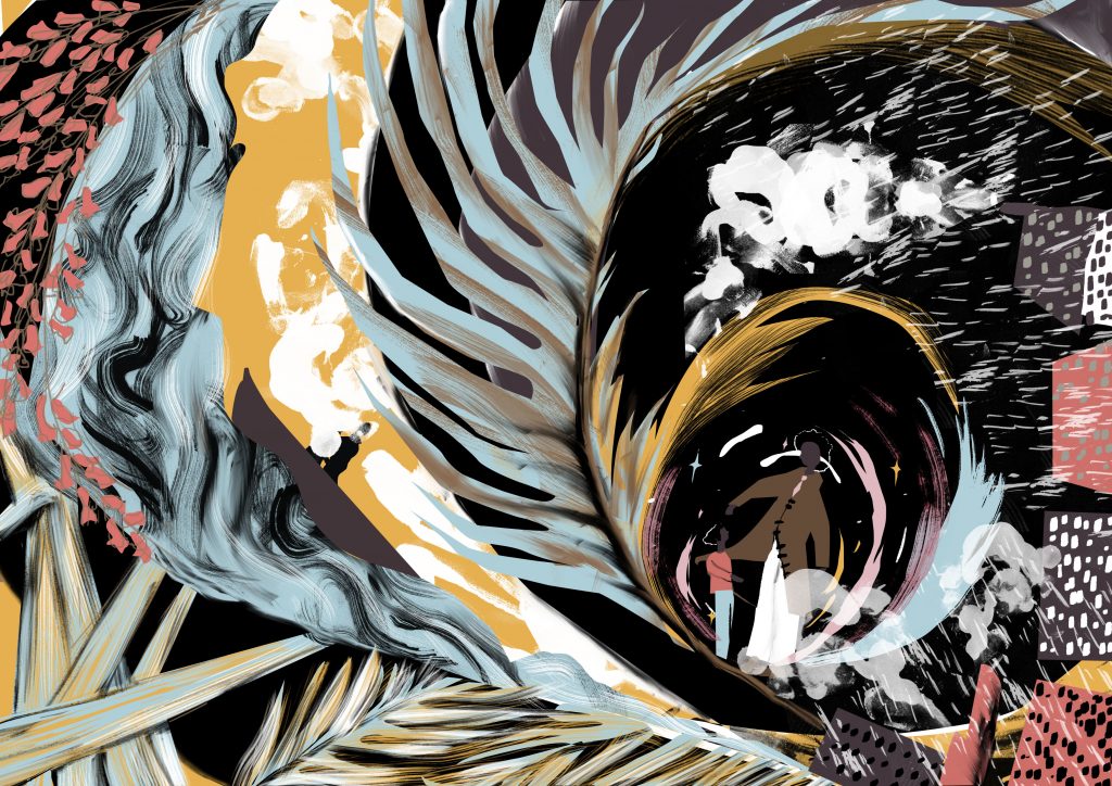 In Cora, Tomekah conveys two worlds meeting, spiralling from comfort to new experiences. Dark industrial Sheffield, bright luscious Jamaica and a boat crossing the ocean swirl around the tiny figure of Cora, whose father is waiting for her at the centre of this overwhelming moment of change.
